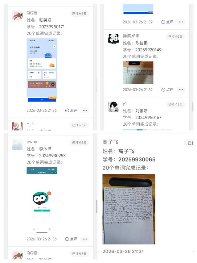 为进一步巩固学习成效,培养自律习惯,同步推出线上“英语单词打卡·自律打卡季”活动。学生每日通过平台完成单词学习任务并进行打卡,活动以群体监督的方式,倒逼学生主动学习、坚持自律,有效助力学生夯实英语基础,养成持之以恒的良好学习习惯,让自律成为青春成长的鲜明底色。
